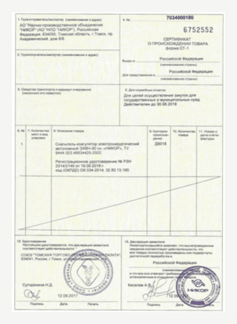 Сертификат СТ-1 для экспорта (Сертификат происхождения) является подтверждением полного или частичного производства товара в стране-экспортере и требуется для создания преференций для госзакупок.