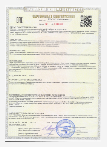 Документ, подтверждающий соответствие продукции требованиям технических регламентов пожарной безопасности.