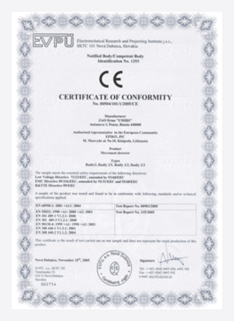 Европейский сертификат соответствия, подтверждающий безопасность товаров для человека, а также их безвредность для окружающей среды. Продукция, не соответствующая требованиям этого стандарта, не может быть допущена на внутренний рынок Евросоюза.